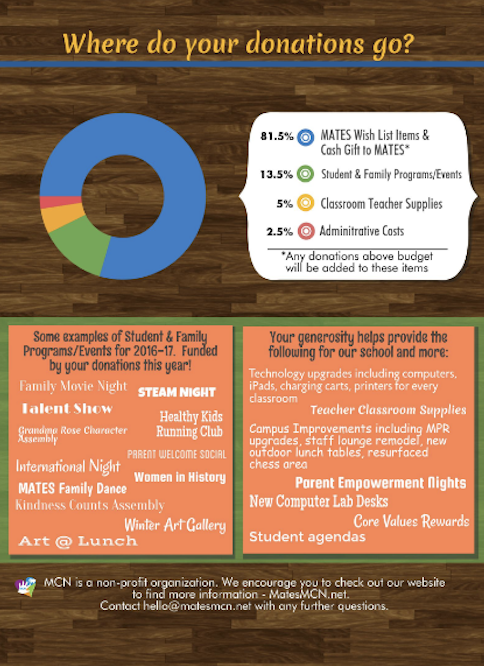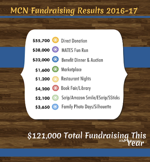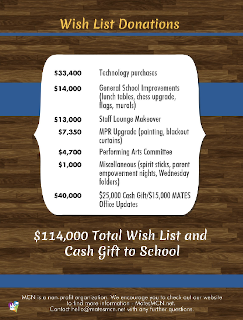 The MCN also works with the administration and MATES Board of Directors throughout the year to identify school needs and wish list items we can donate funds toward or purchase. We raised enough money last year to do so much for the school!