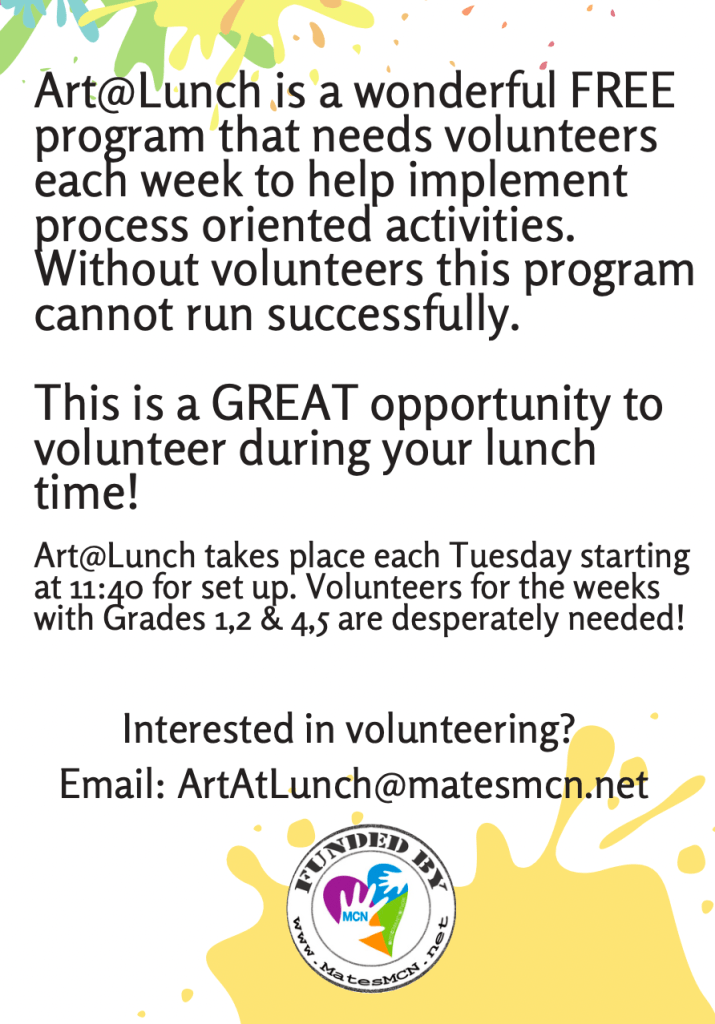 You can volunteer your time, your expertise, and offer materials. If you are available at any point between 11:40 am & 1:00 on Tuesdays, please contact artatlunch@matesmcn.net.