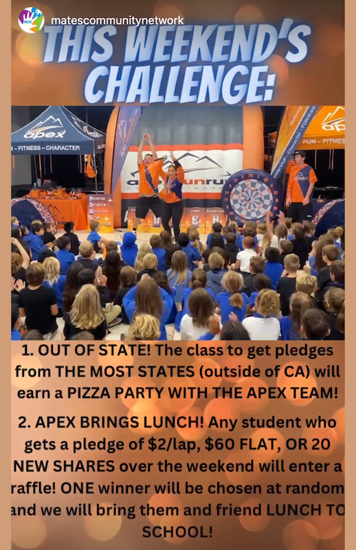 Any student who gets a PLEDGE of $2/LAP, $60 FLAT, OR 20 NEW SHARES over the weekend will enter a raffle! ONE WINNER will be chosen at random, and APEX WILL BRING THEM & A FRIEND LUNCH TO SCHOOL!
