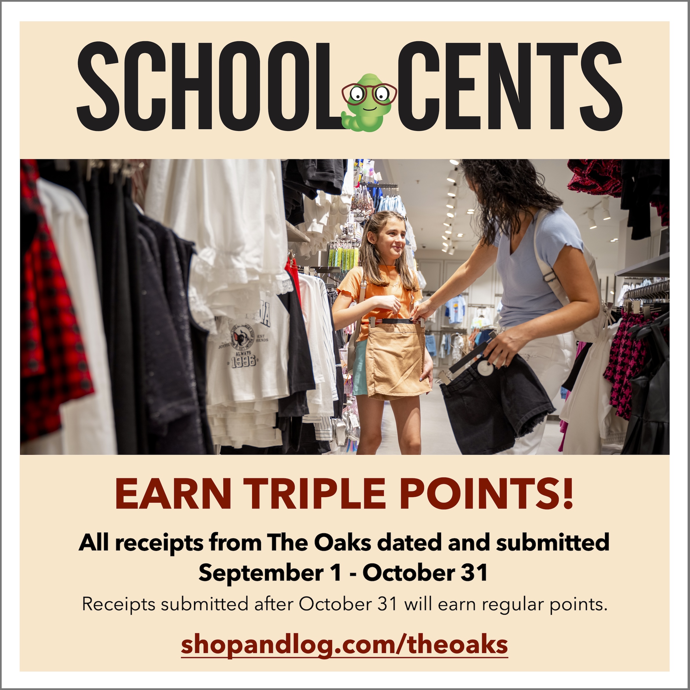 MATES is participating in the School Cents program at The Oaks Mall this year! Help our school earn $500 to $2,500 by submitting your receipts from The Oaks Mall between September 1, 2024 and April 30, 2025.