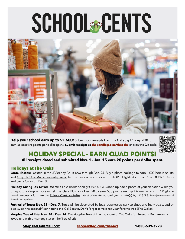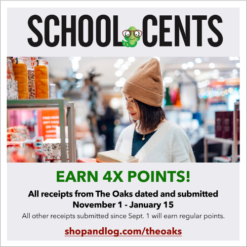 MATES is participating in the School Cents program at The Oaks Mall this year! Help our school earn $500 to $2,500 by submitting your receipts from The Oaks Mall between September 1, 2024 and April 30, 2025.