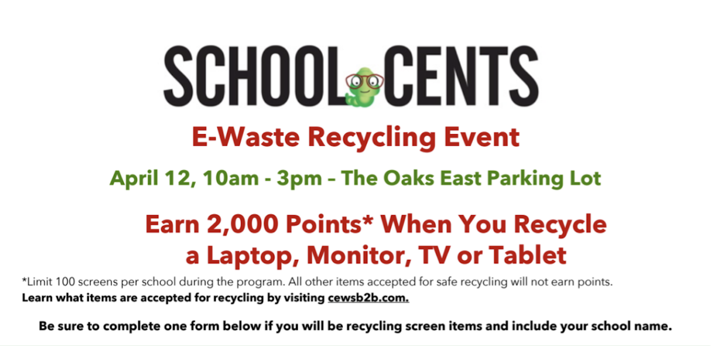 Earn 2,000 points* when you recycle a laptop, monitor, TV or tablet. All other items accepted for safe recycling will not earn points. Click Here to download a form with more info and to credit your school for points.
