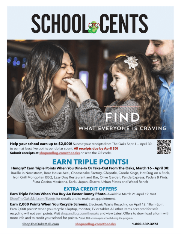 MATES is participating in the School Cents program at The Oaks Mall this year! Help our school earn $500 to $2,500 by submitting your receipts from The Oaks Mall between September 1, 2024 and April 30, 2025.
