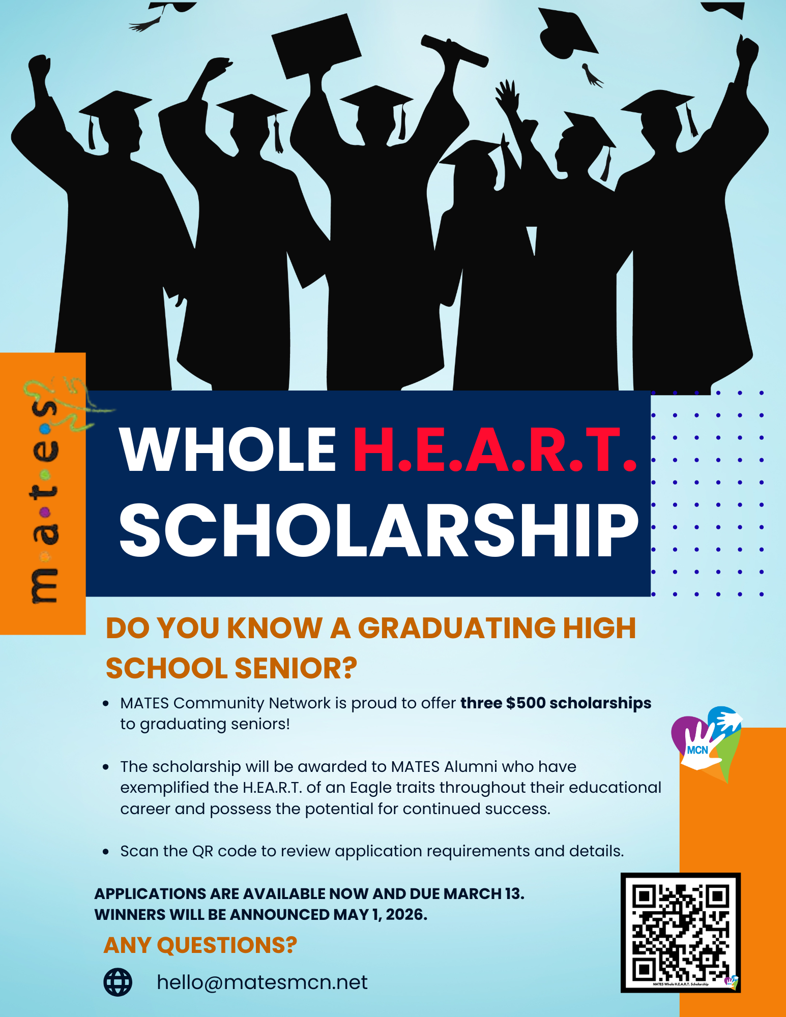 πŸ—£οΈπŸ“£ The MATES Community Network at MATES Charter School Proudly Offers ThreeΒ $500 ScholarshipsΒ to πŸŽ“ Graduating High School Seniors Who:
