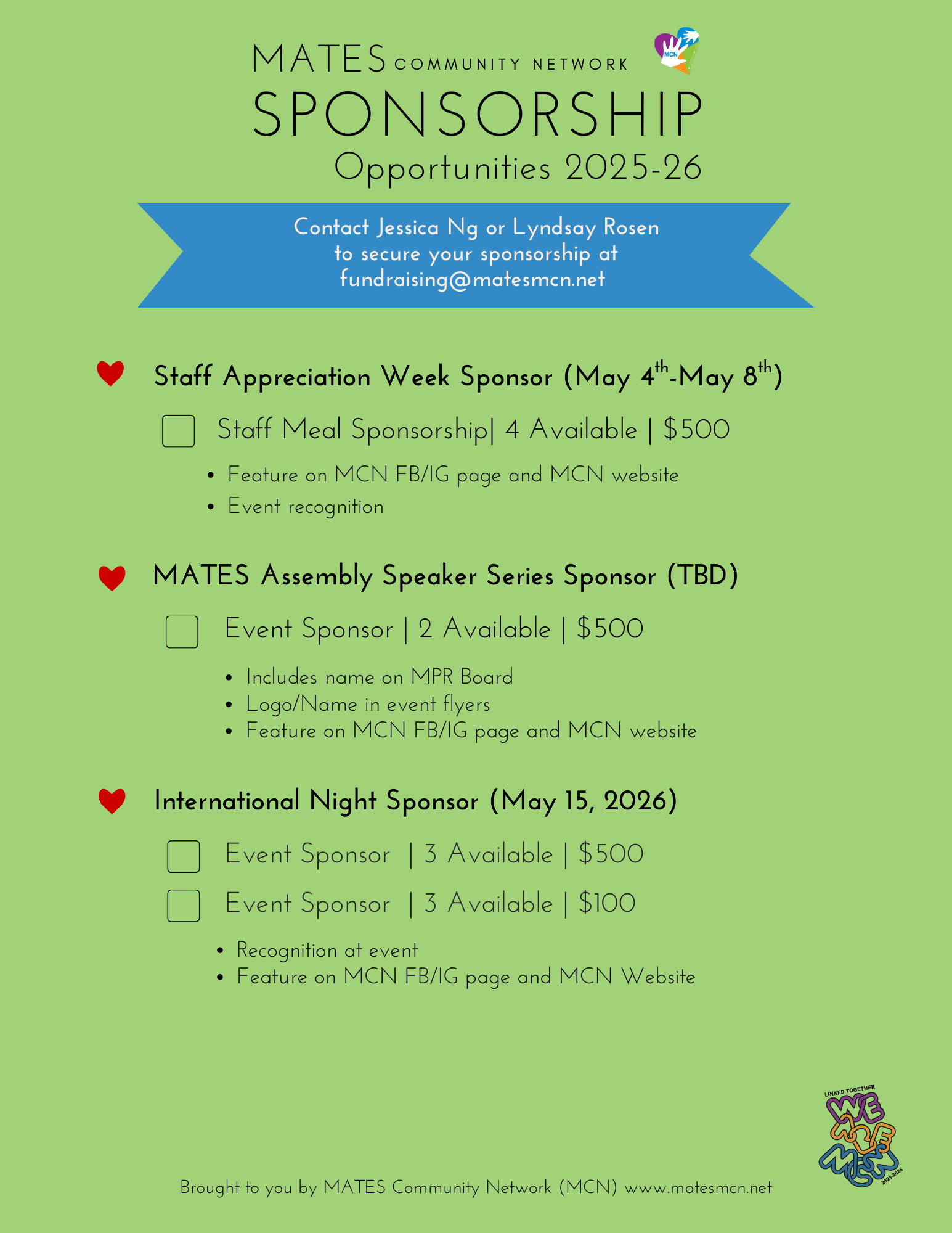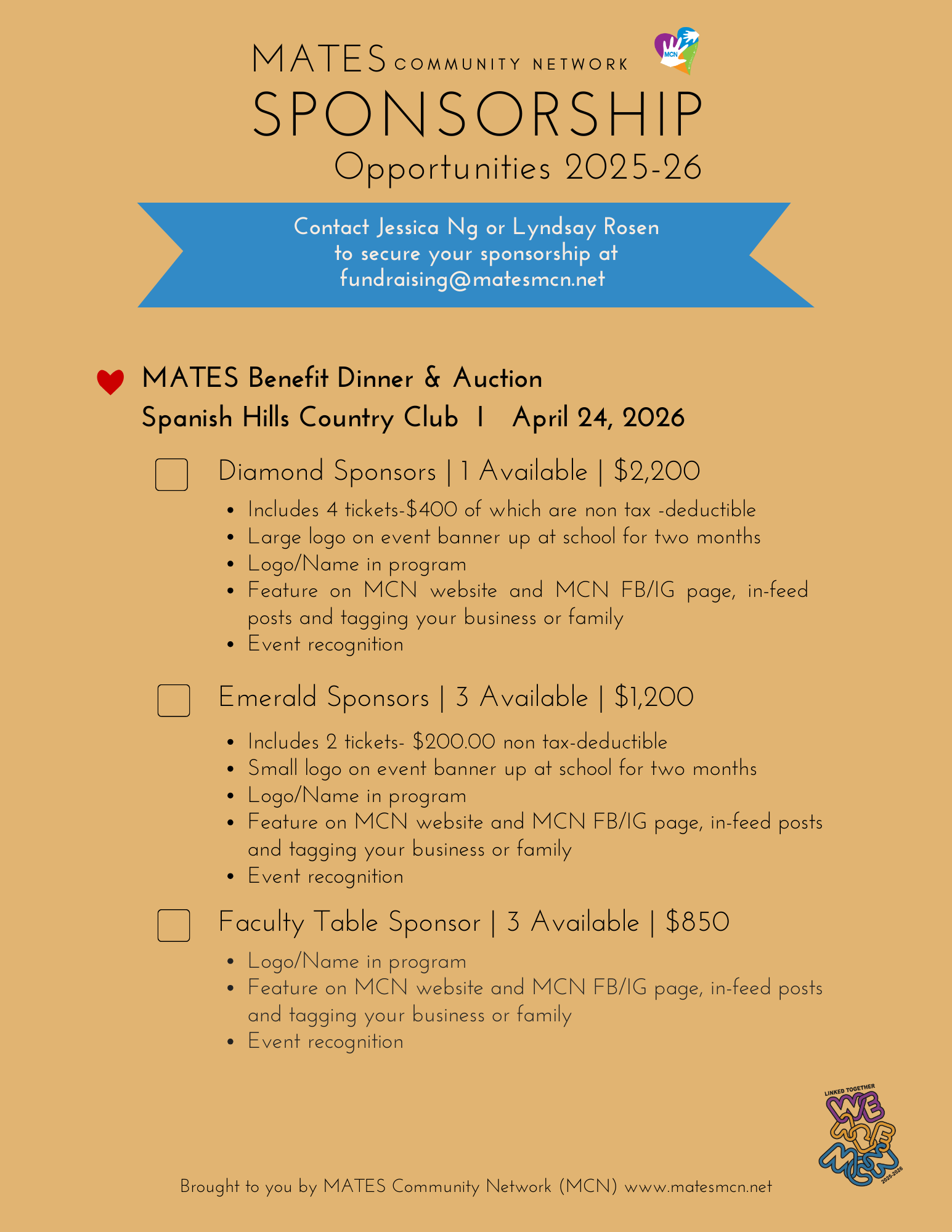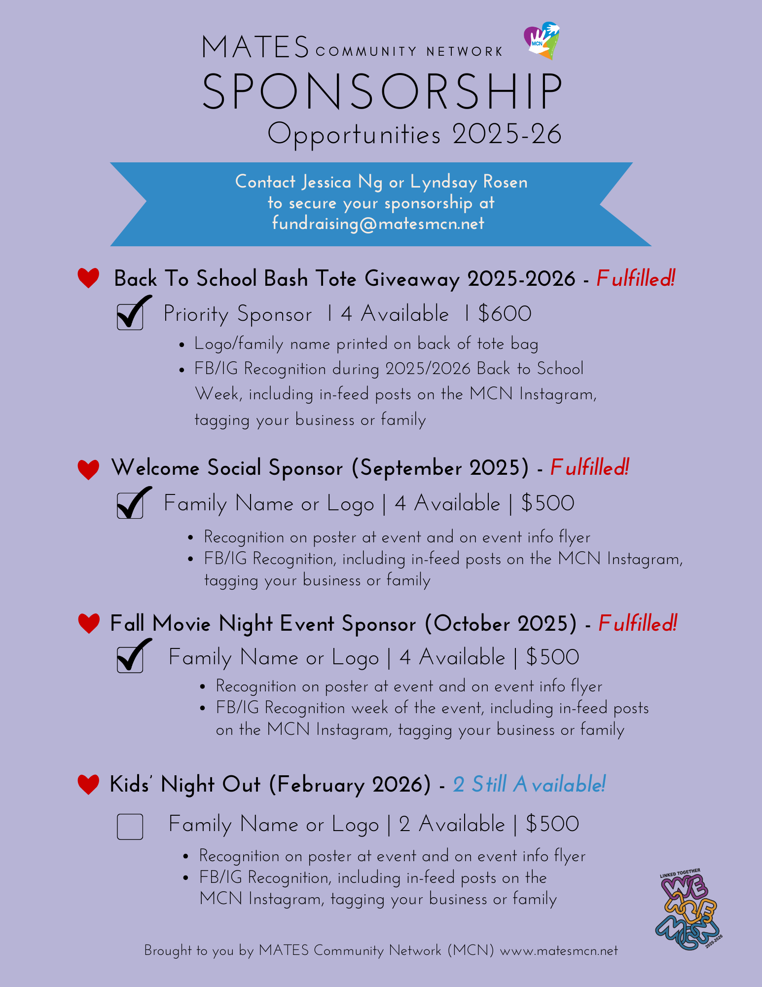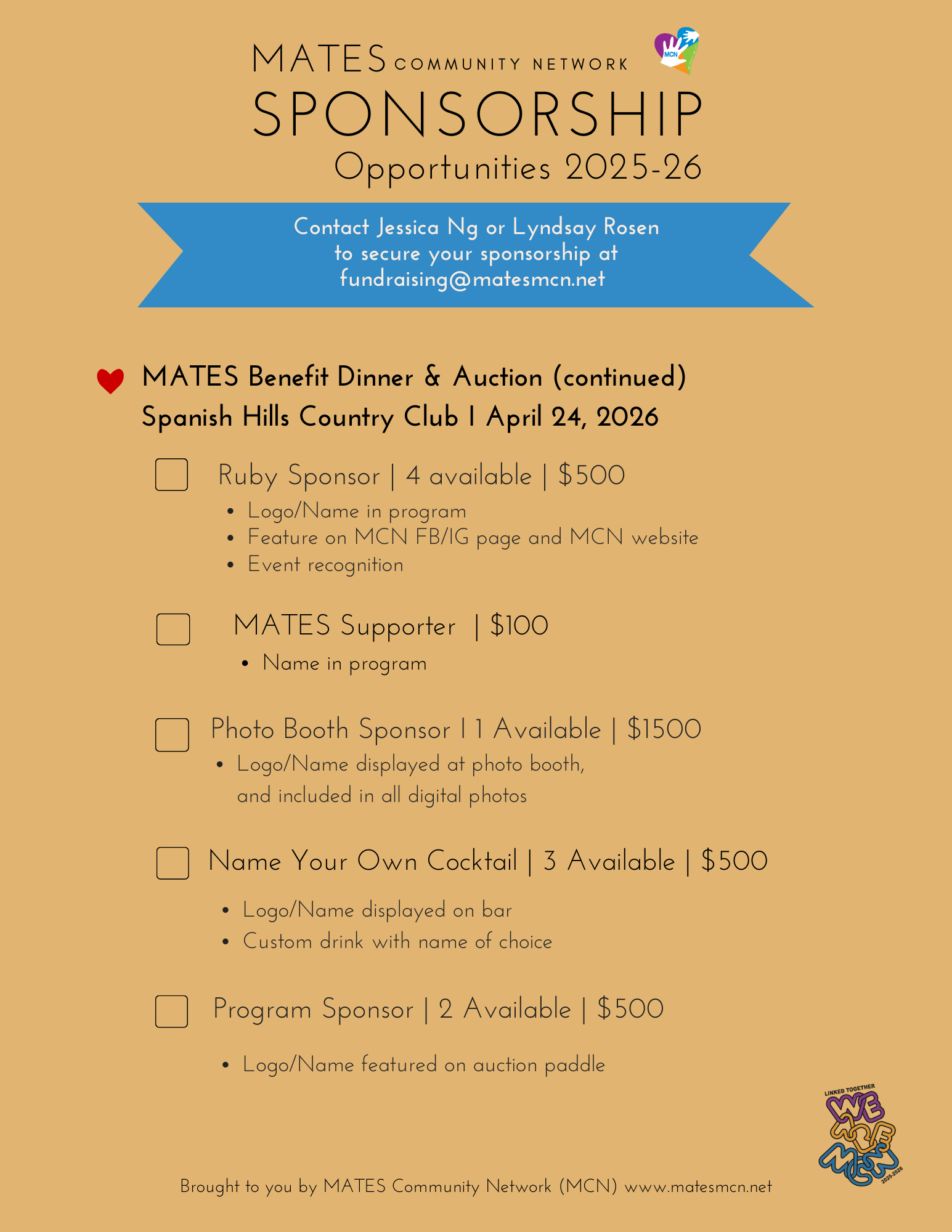 Jessica Ng or Lyndsay Rosen, our Fundraising Co-Chairs at: Fundraising@MatesMCN.Net