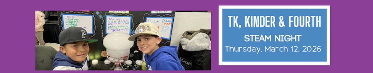 STEAM Night – STEAM Night will feature community exhibits as well as student projects. Help make this event a success. While the primary grade-level volunteers for STEAM Night are TK, Kindergarten, and 4th Grade, families from all grade levels are welcome to participate. Please sign up below. We appreciate all your support!