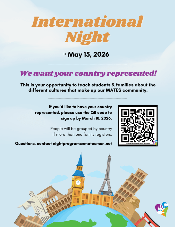 INTERNATIONAL NIGHT – Represent your country, and share your culture! Participants will be grouped by country if more than one family registers.