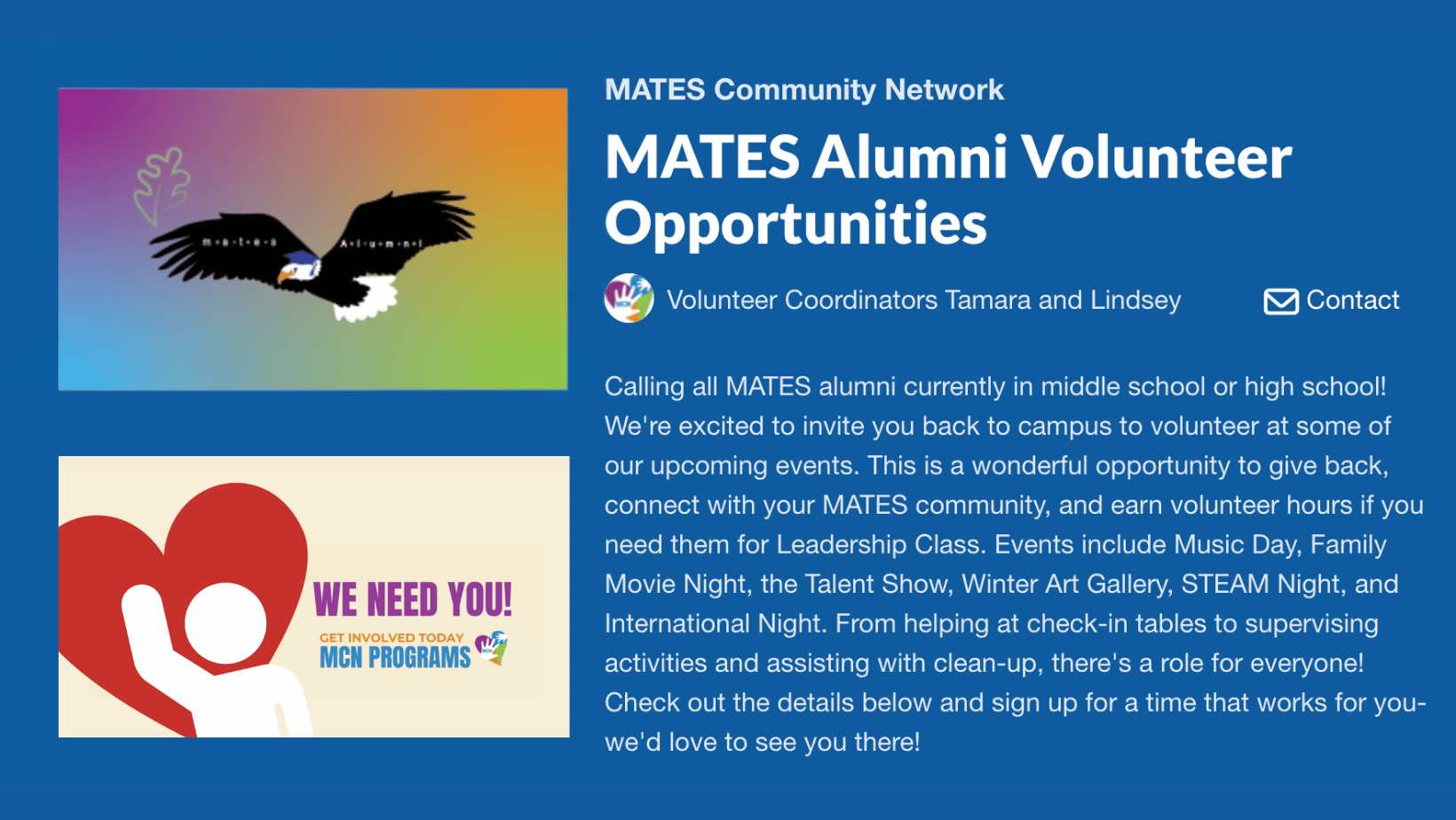 We couldn’t do it without all the dedicated volunteers at our school. Come and join us! There is a place for everyone to help make an event or program the best it can be here at MATES.