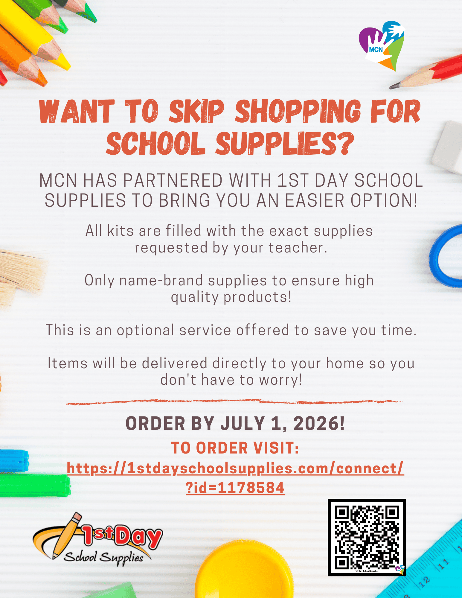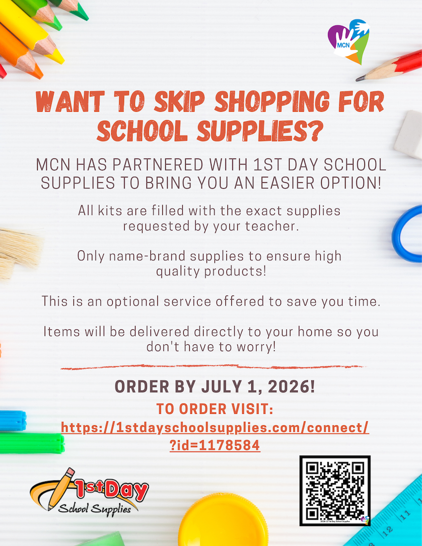 It’s never too early to get a head start with your school supplies! MCN has partnered with 1st Day School Supplies for your convenience. Purchasing from this vendor is optional. MCN is simply happy to offer a time-saving way to collect the items!