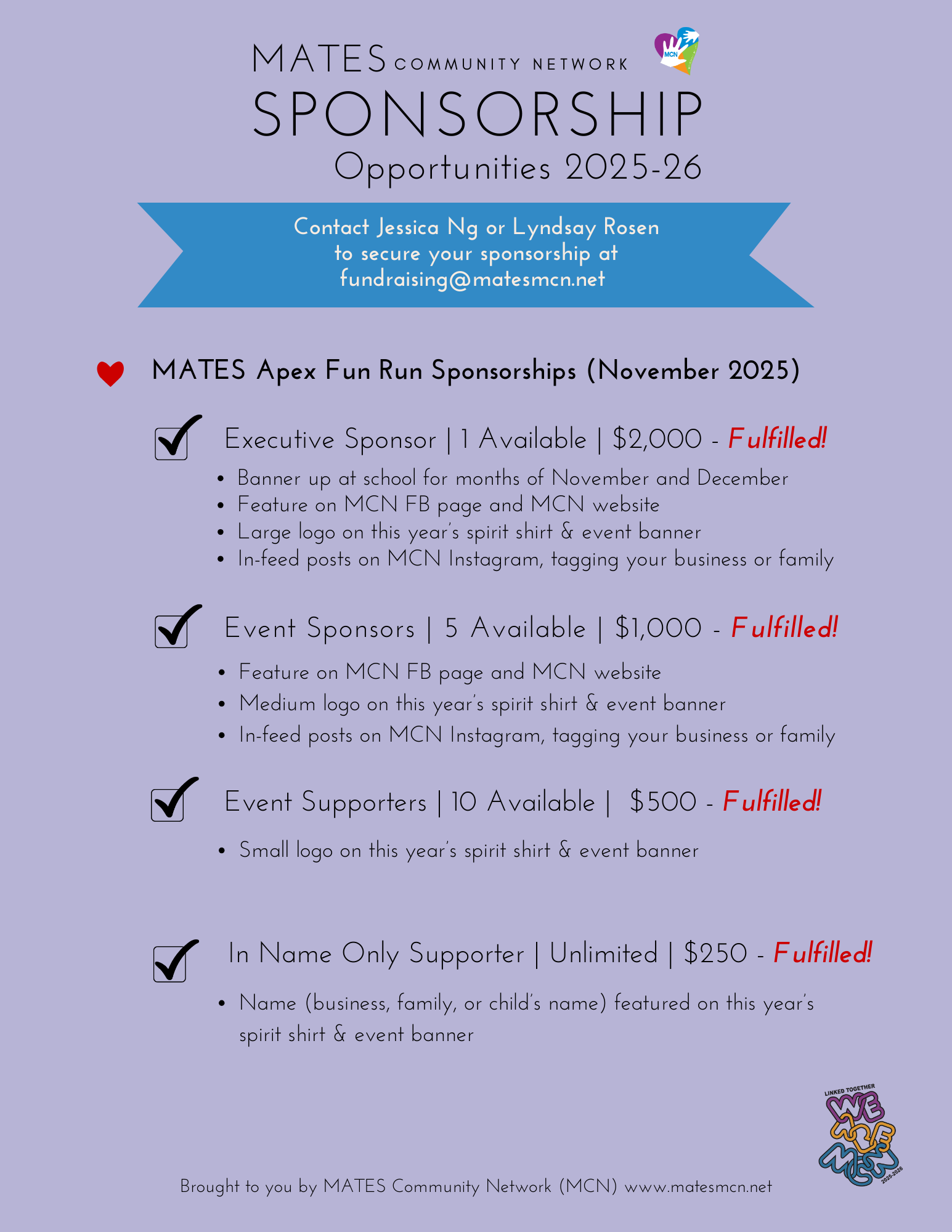 Find the right fit for you! Feature your business while supporting MCN events and fundraisers. Gain community visibility with recognition online, during the event, and on campus — this way, the MATES Community can support you! WIN WIN!! β€οΈ