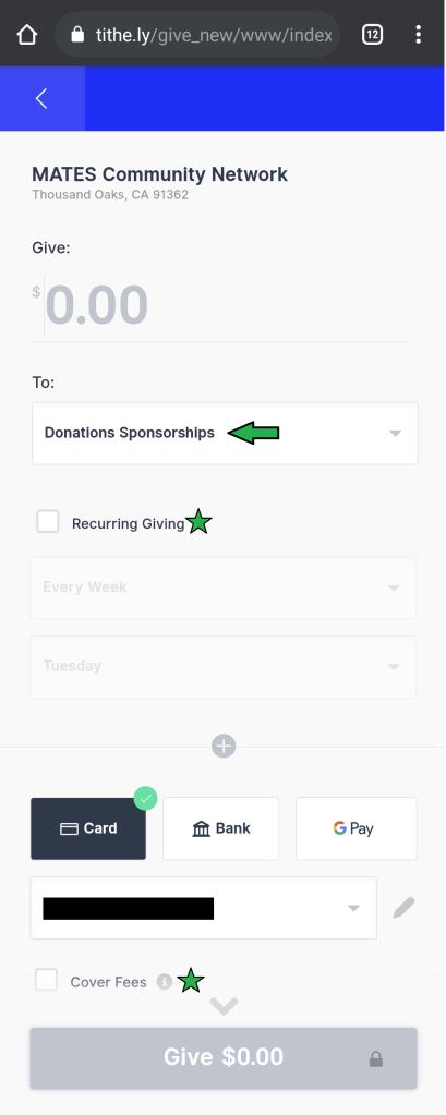 Once you have entered all necessary information, the Give button at the bottom will turn green, and you can make your donation!