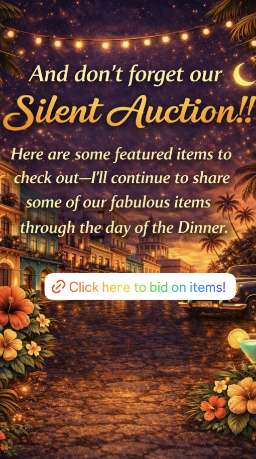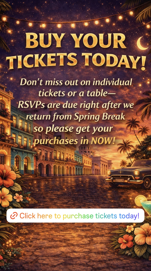Think warm tropical evenings, 🌙 vibrant colors, lively music, 🎶 and a festive atmosphere inspired by Old Havana. Guests can have fun with the theme by wearing tropical-inspired cocktail attire — breezy dresses, linen shirts, florals, bright colors, and a touch of island flair. 🌴 It’s going to be a beautiful, energetic night filled with great food, live music, dancing, 💃🕺🏽 and of course an exciting auction!