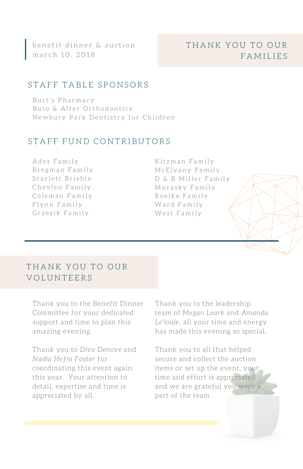 Thank you for overseeing our wonderful Benefit Dinner!