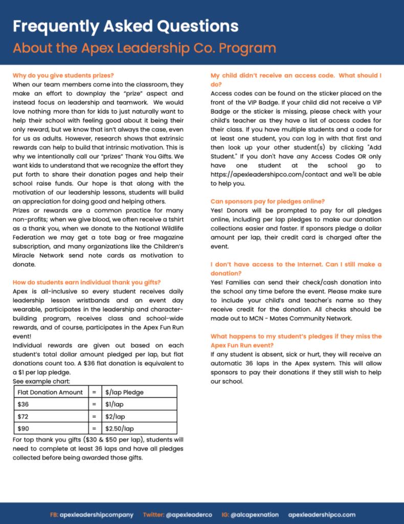 LOG IN – SHARE – PLEDGE! Link your student’s pledge page to support our @ApexLeadershipCoLA Fun Run!