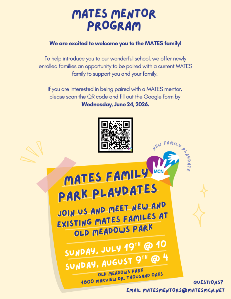 Once you are enrolled, the MATES Mentor Program pairs you with a mentor (current MATES family) to help acclimate you to our wonderful school.
