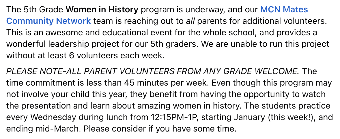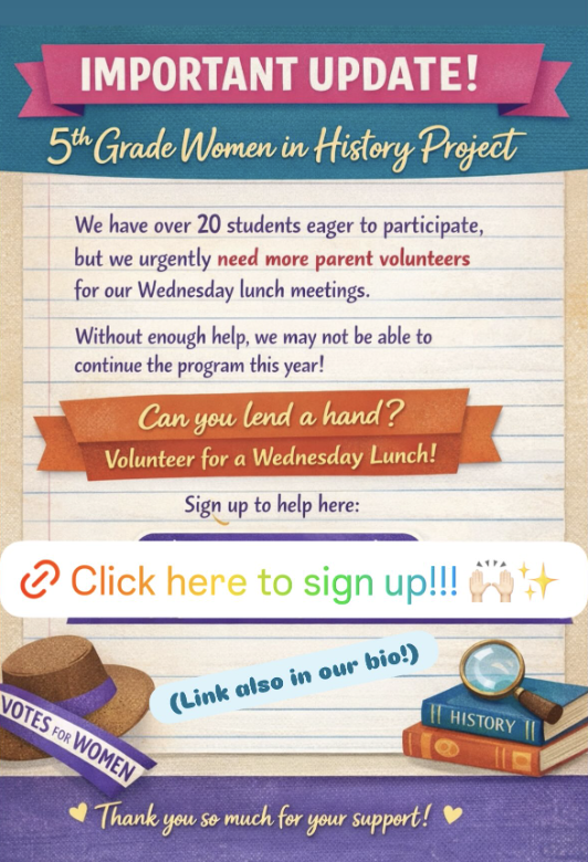 To pull this off, we will need A LOT of parent volunteers. Volunteers will work with the students to research their assigned historical figure, create signs and props for the play, learn and rehearse lines, and organize costumes for their performance on Wednesday, March 25th. Please help make this important and cherished event happen. Even coming in for one lunch period can make a huge difference!