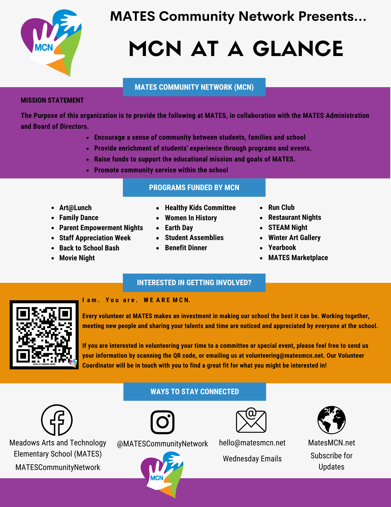 MATES is a school of choice with an energetic and talented community of parents, teachers, and students. It needs a dynamic and flexible organization to match. The MCN is similar to the PTA (Parent Teacher Association) structure, but has the flexibility of being independent from a national organization. That flexibility gives MCN more opportunities for fundraising than a traditional PTA.