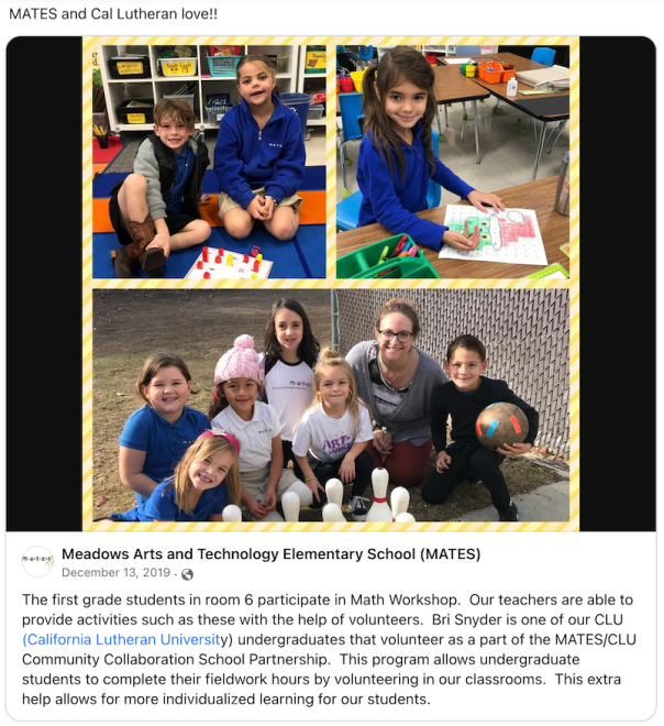 This is an exciting alliance that was formed in 2019. Both California Lutheran University (CLU) and Meadows Arts and Technology Elementary School (MATES) are strong forces in the community, and this collaboration is so mutually beneficial.