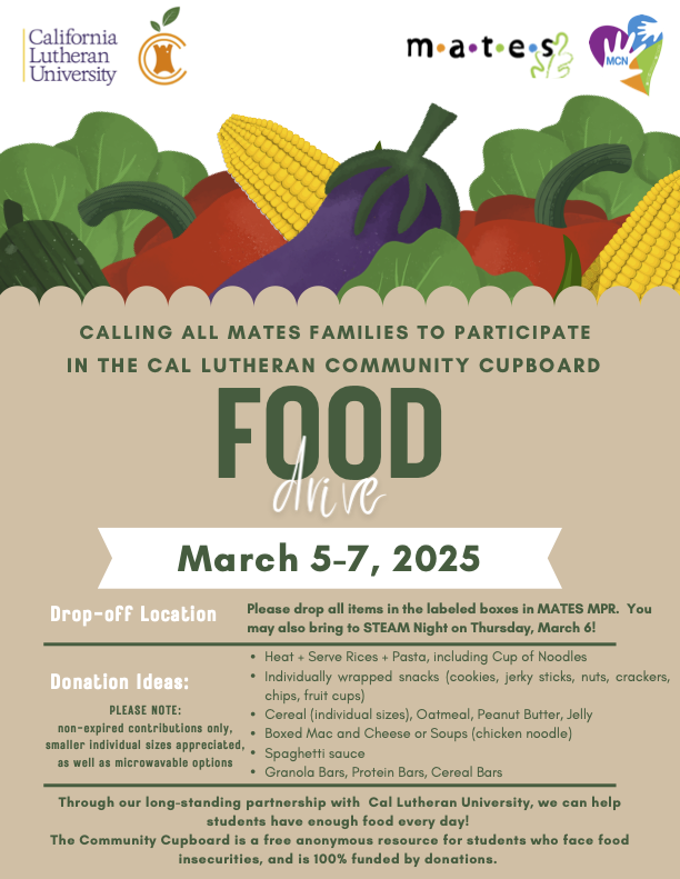 We had a successful Food Drive Week in conjunction with our STEAM Night! All contributions support the California Lutheran University Community Cupboard, where their pantry is 100% filled by donations to help food insecure students.